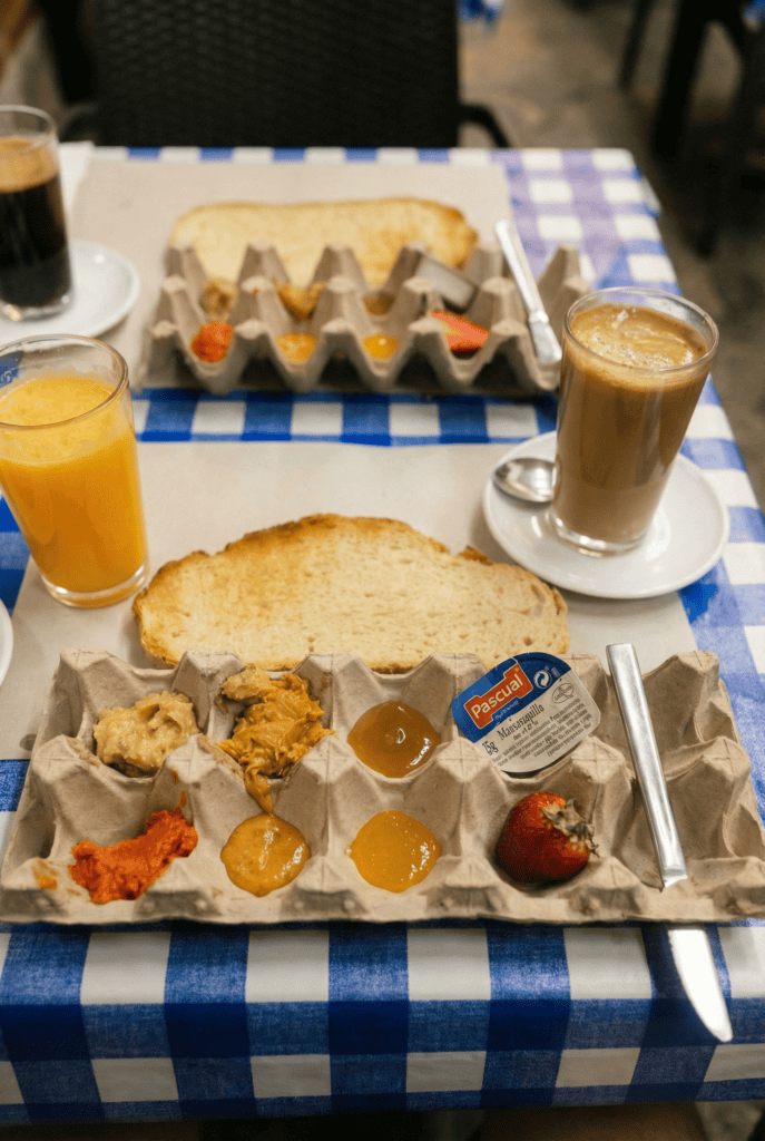 Order the desayuno completo. They bring you a massive slice of toasted bread and a wooden egg carton filled with different “mantecas” (savory spreads), jams, and fresh fruit. It is unpretentious and perfectly local. It’s the kind of place where time slows down, and you can just watch the world wake up.